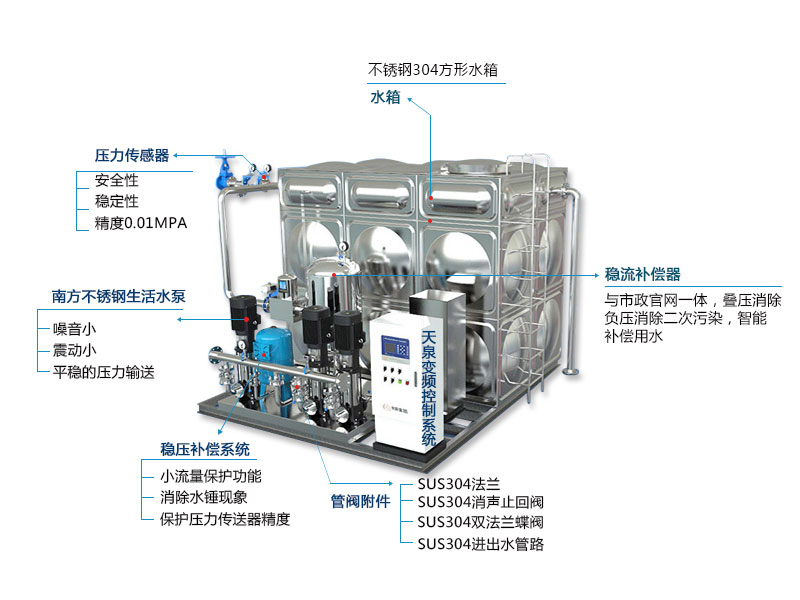 差量補償箱式無負壓供水設備可直接與供水管網鏈接,確保供水管網不產生負壓,在高峰時將密閉水箱的水增壓可補償供水管網供水量的不足,滿足用戶用水需要的設備。主要由密閉水箱、主泵機組、變頻控制柜、增壓裝置、穩流罐、無負壓流量控制器、保壓裝置及壓力傳感器組成。