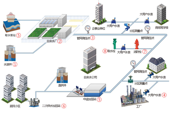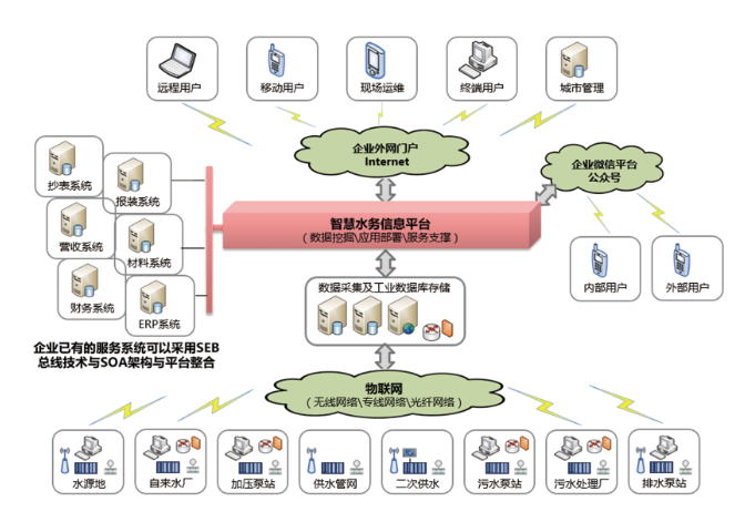 智慧水務(wù)通過數(shù)采儀、無線網(wǎng)絡(luò)、水質(zhì)水壓表等在線監(jiān)測設(shè)備實時感知城市供排水系統(tǒng)的運行狀態(tài),并采用可視化的方式有機(jī)整合水務(wù)管理部門與供排水設(shè)施,形成"城市水務(wù)物聯(lián)網(wǎng)"并可將海量水務(wù)信息進(jìn)行及時分析與處理,并做出相應(yīng)的處理結(jié)果輔助決策建議,以更加精細(xì)和動態(tài)的方式管理水務(wù)系統(tǒng)的整個生產(chǎn)、管理和服務(wù)流程,從而達(dá)到"智慧"的狀態(tài)。